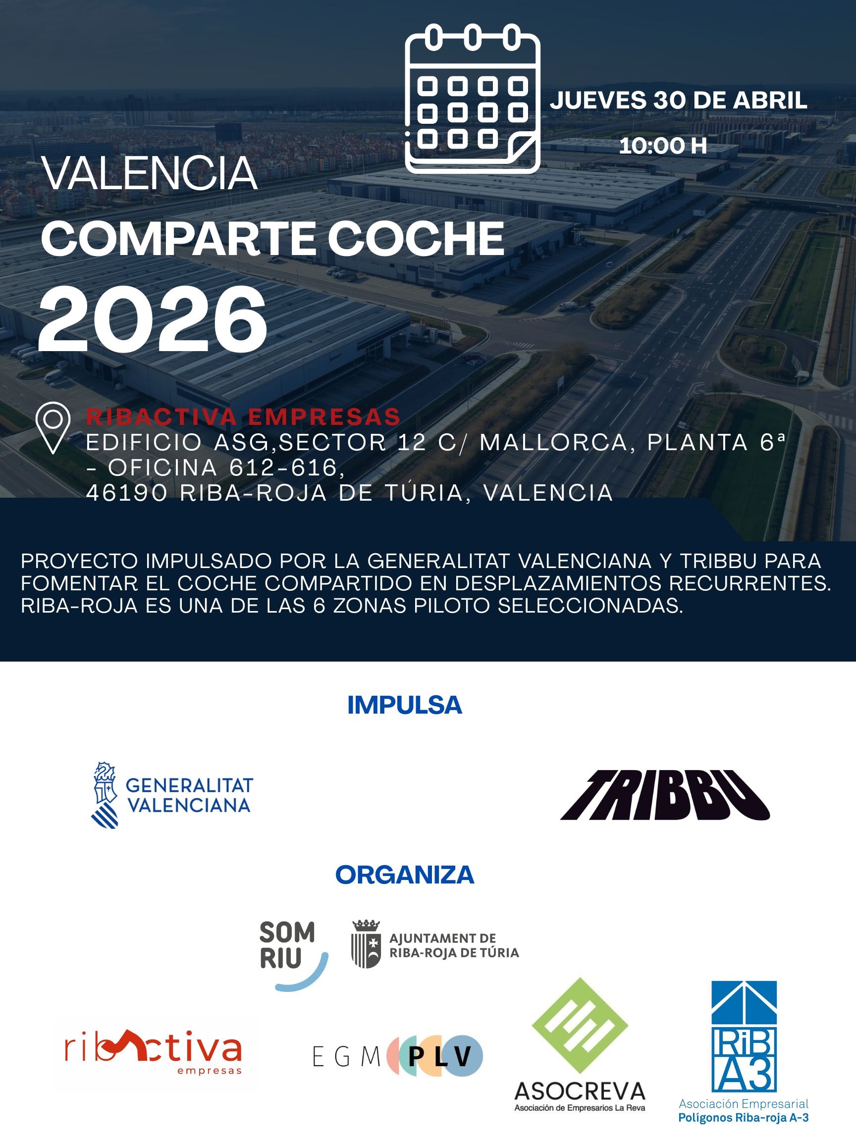 Desde Asocreva somos conscientes de los problemas de tráfico que afecta nuestra área Desde Asocreva somos conscientes de los problemas de tráfico que afecta nuestra área industrial, por eso nos sumamos y respaldamos esta iniciativa. Ir a trabajar solo cada día no es solo rutina. Es gasolina y tiempo que se van. Y eso ya no tiene sentido. La zona industrial y logística de Riba-Roja ha sido elegida para el proyecto Valencia Comparte Coche, la nueva apuesta de la Generalitat Valenciana para mejorar cómo nos movemos por las grandes áreas de Valencia.